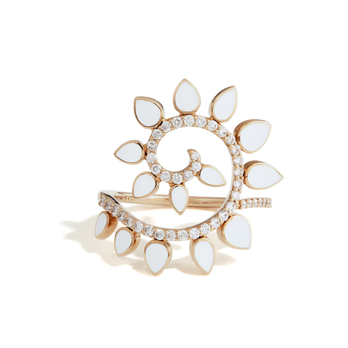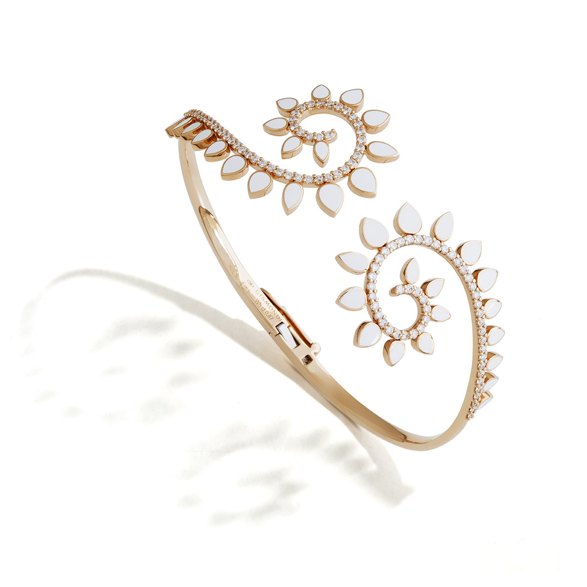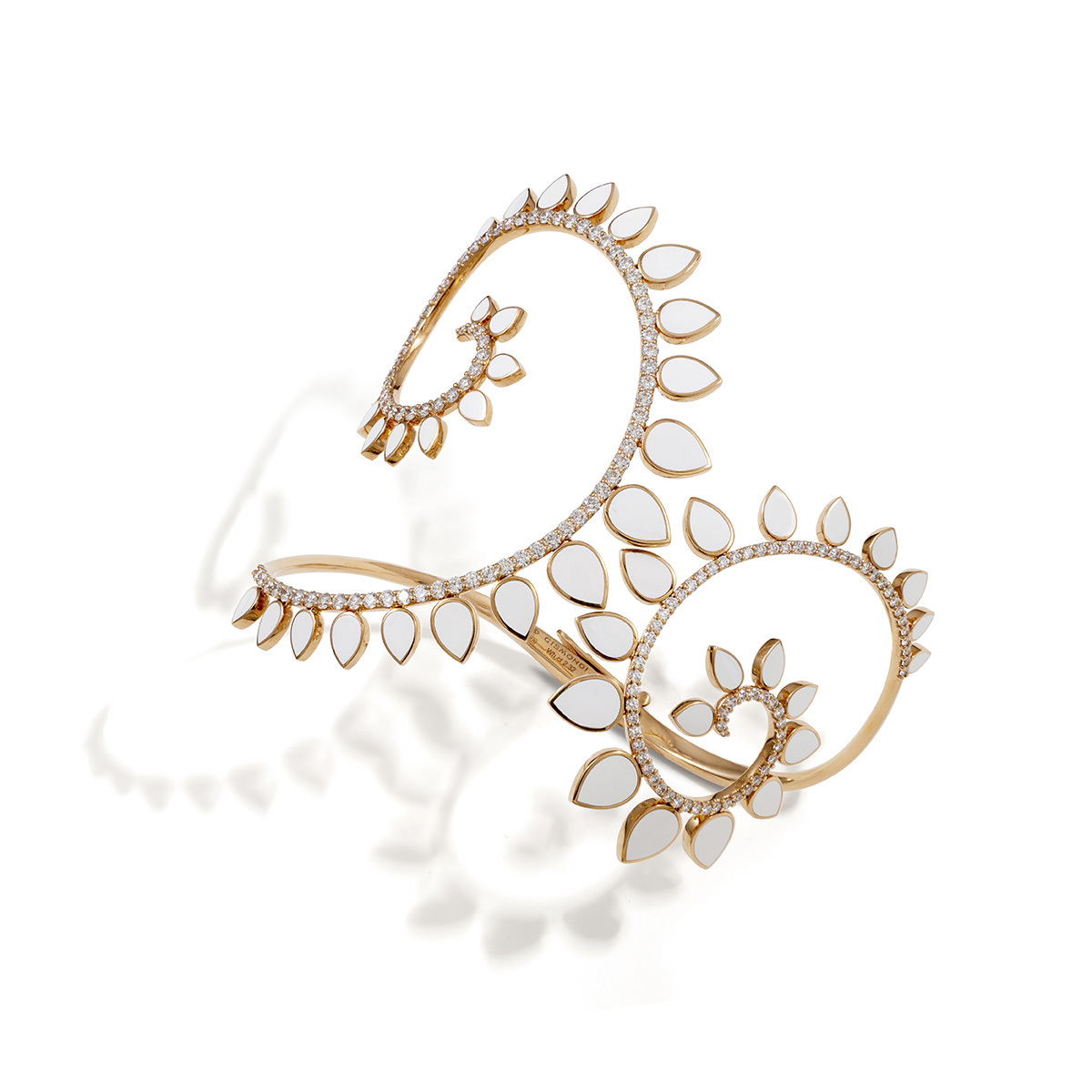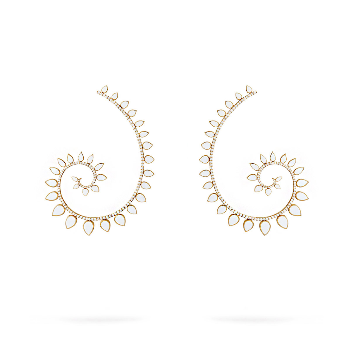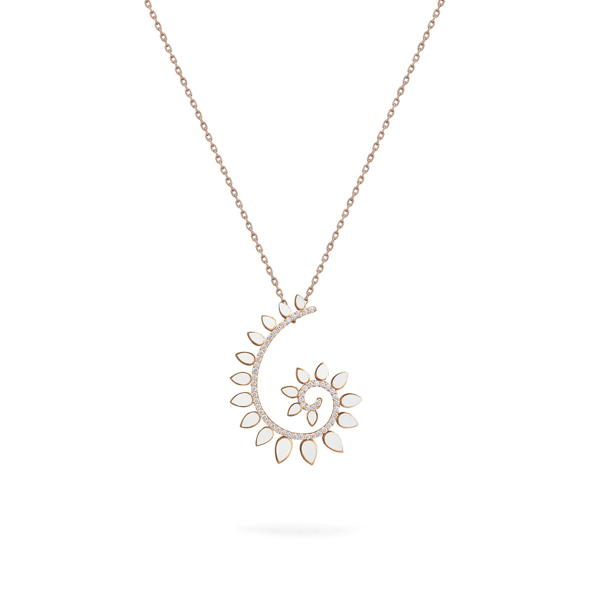 La collezione celebra il codice genetico che si ripete in natura, espressa e reinterpretata con un percorso di diamanti bianchi su una raffinata spirale in oro rosa, come la sezione della conchiglia di struttura primitiva dell'oceano indiano: il Nautilo appunto. Ai due lati, gocce delicate in ceramica bianca.
