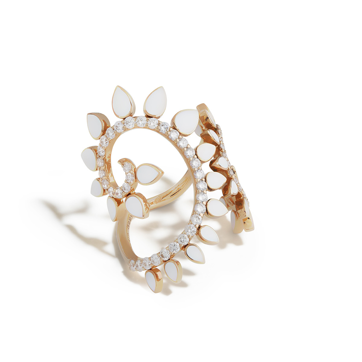 La collezione è composta di anelli, collane, orecchini e bracciali in oro rosa, diamanti bianchi e ceramica bianca, materiale più resistente dello smalto, dal colore inalterabile. La ceramica è sottoposta a cottura in forno a 50 gradi per 48 ore, successivamente viene tagliata seguendo la forma desiderata delle gocce a cui verranno applicati i bordi in oro e unite al gioiello.
